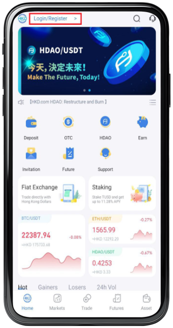 Step 1 : Log in to HKD.com App and click【 Login / Register 】 in the upper left corner of the page.