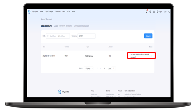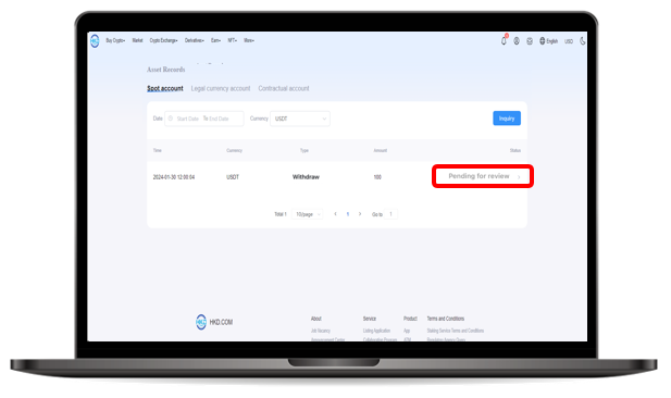 Log in to your HKD.com account and click on【 Assets 】 Select the currency column for the transaction records you want to view and check the asset deposit and withdrawal records. If the【 Status 】 column shows the transaction as " Pending Approval, " please wait for the confirmation process to complete.
