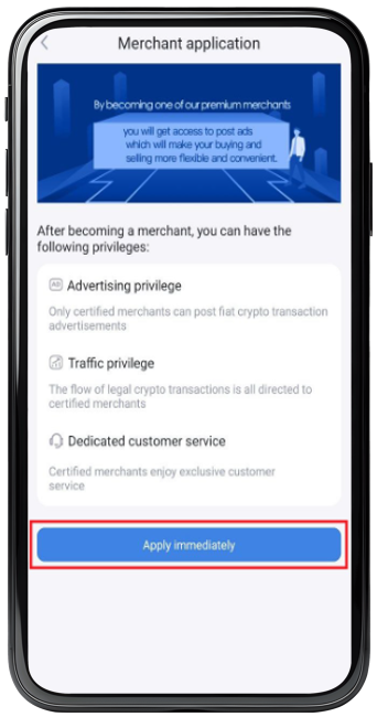 2, Users must ensure there is a sufficient balance of 5000 USDT in their accounts to complete the application for the C2C Merchant Recruitment Program. The funds need to be transferred to your fiat account wallet as a merchant security deposit.