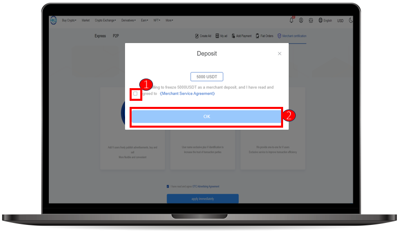 ① Check the box to agree to freeze 5000 USDT as a merchant security deposit and agree to the Merchant Services Agreement.