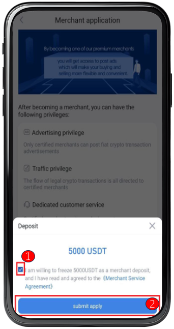 ① Click the box to agree to freeze 5000 USDT as a merchant security deposit and agree to the Merchant Services Agreement.