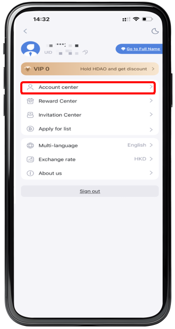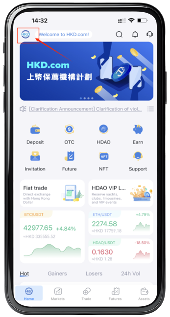Step 1 : Log in to the mobile APP and【 Click 】on the HKD icon in the top-left corner of the homepage.