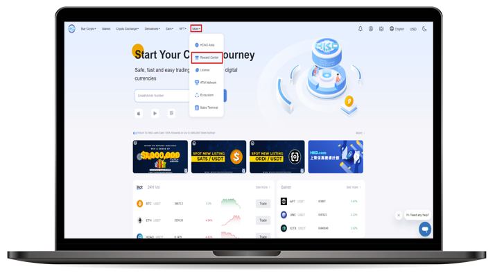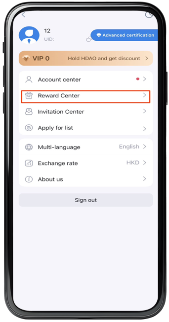 Step 1 : After login into the HKD.com web version, click on【 More 】at the top, and select 【 Reward Center 】