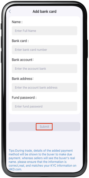 If you need to bind a bank card, WeChat or Alipay when conducting OTC transactions, you can log in to the HKD.com APP or Web to bind.