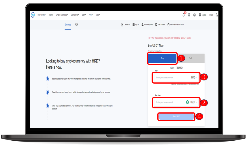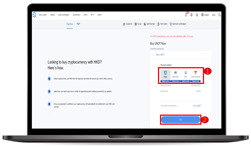 Notice : In order to ensure the security of both parties' assets, HKD.com implements a withdrawal strategy for RMB OTC and P2P. For Chinese Yuan (RMB), we adopt a “ T+2 " withdrawal limit, providing a 48-hour buffer period. For Hong Kong Dollar (HKD), we adopt a “ T+1 " withdrawal limit, providing a 24-hour buffer period. This not only helps prevent illegal fund inflow and reduces the risk of user asset loss but also maximally restricts money laundering activities on the platform, minimizes the risk of bank account freezing, and ensures users enjoy a secure trading environment. Users' trading activities (spot, futures, leverage trading, etc.) will not be affected during this period.