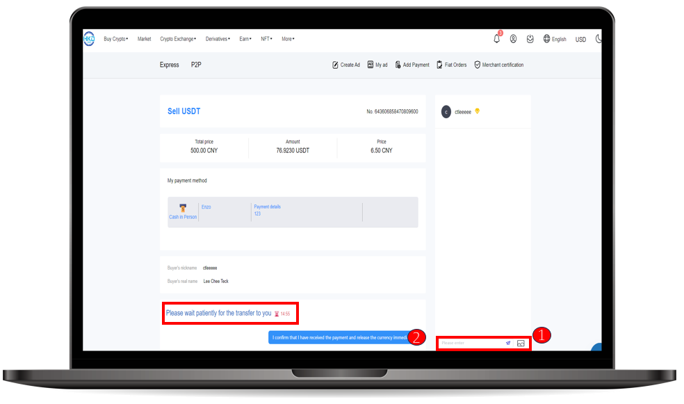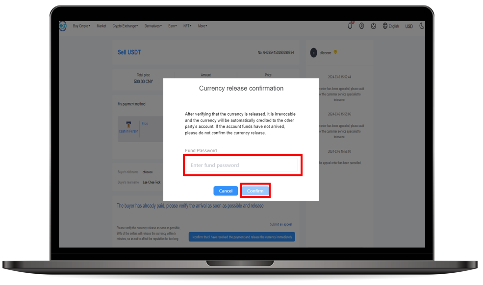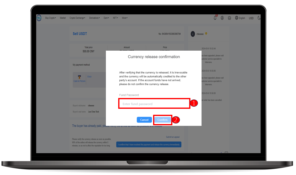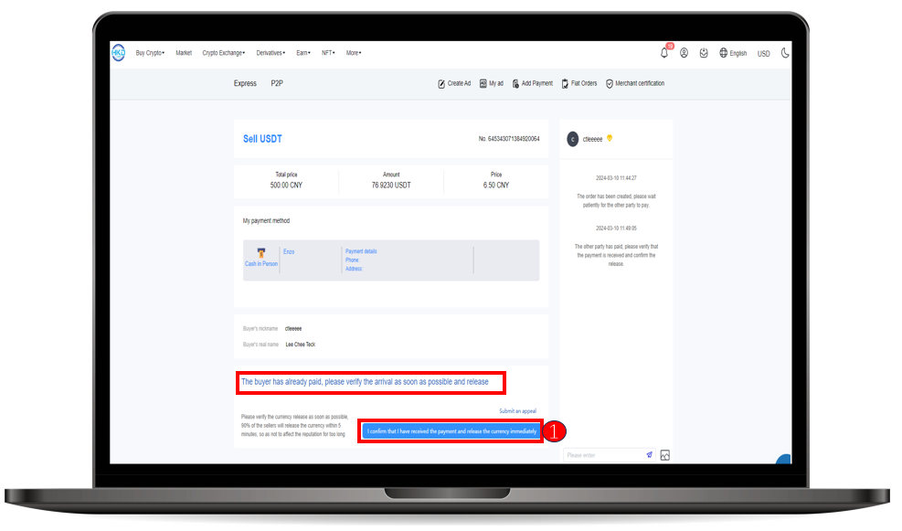 ② Please refrain from clicking the "I confirm I have received payment" button before the merchant has clicked "Paid." Clicking prematurely may result in releasing the funds before receiving them, leading to potential financial loss.