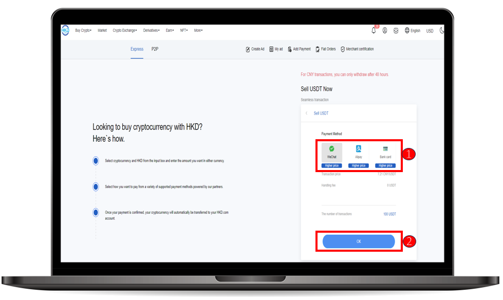 ③ Click the dropdown menu to select either【 RMB 】or【 HKD 】for fiat currency transactions.
