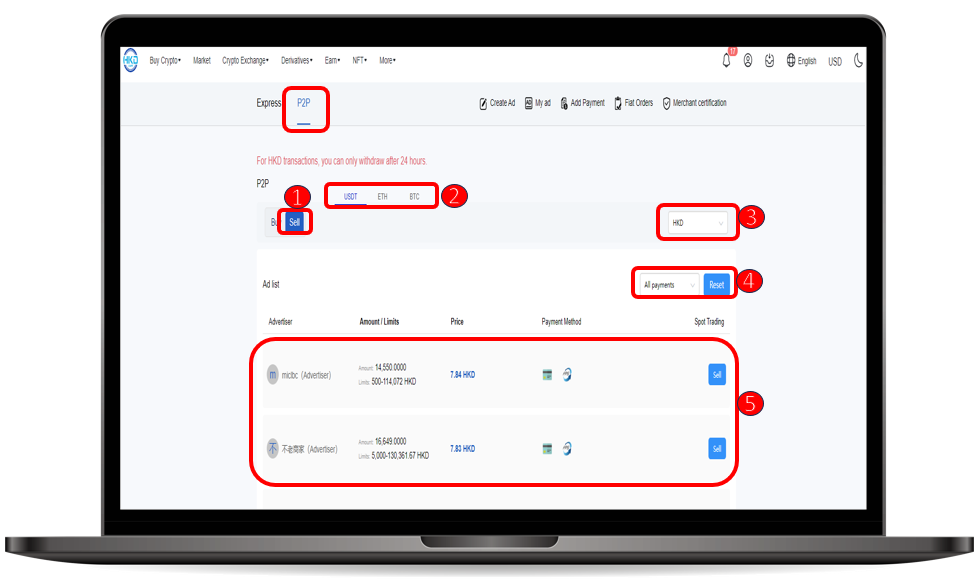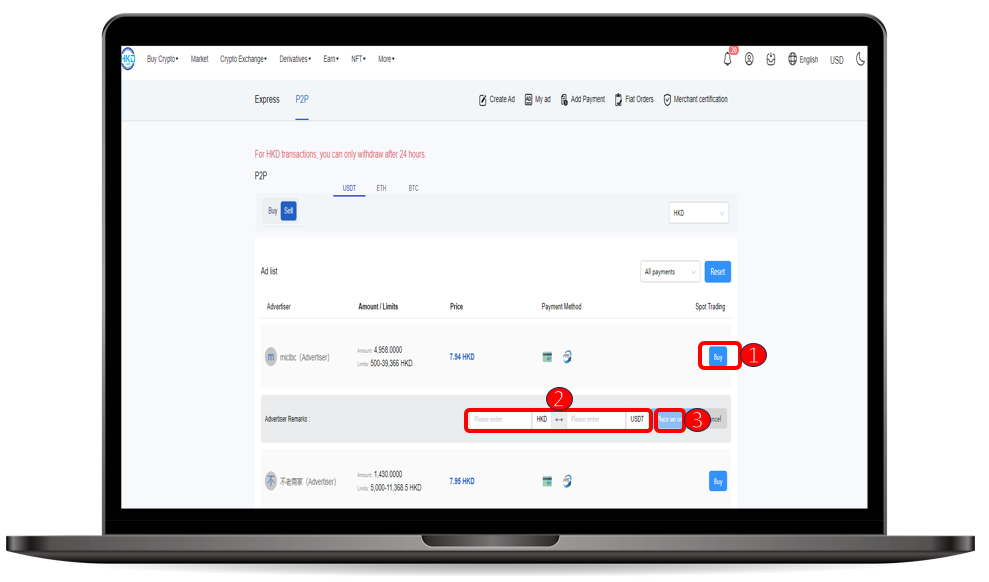 For OTC trading on HKD.com, users must register an account and complete KYC identity verification. Upon successful identity verification, users are required to link a payment method. Transactions can be conducted using methods such as cash, bank transfers, or other instant transfer options. The minimum transaction amount will depend on the limits set by the individual merchant.