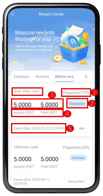 •One-time Card : This card can only be used once. Any remaining balance of the unredeemed rebate card, regardless of the amount, will expire after use. After users receive the rebate card, they will need to manually click “ USE " to activate the rebate card.