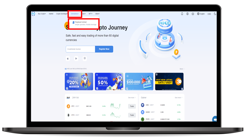 Step 1 : Log in to the HKD.com web version and click【 Derivatives 】at the top and select【 Perpetual Contract 】