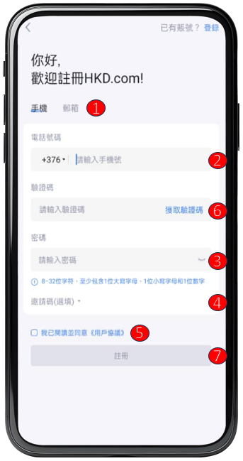 ⑧ 点击【 立即注册 】并成功完成注册HKD.com账户 。