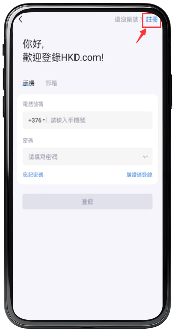 步骤 1 :登入HKD.com App 并点击页面左上方【 登录/注册 】