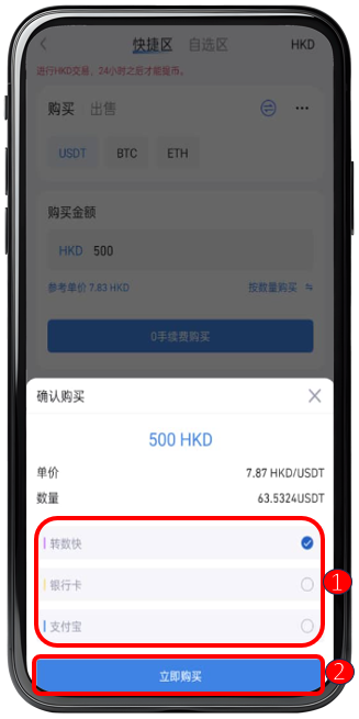 ① 点击选择以【 RMB 】或【 HKD 】进行转账购买。