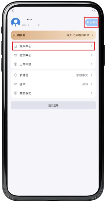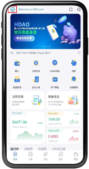 步骤 1 :登入账号后,点击左上角的 HKD.com 标志 。