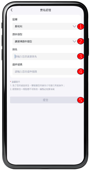 ⑤ 请确保输入的所有信息与您的身份证件或护照一致。提交后将无法进行更改。