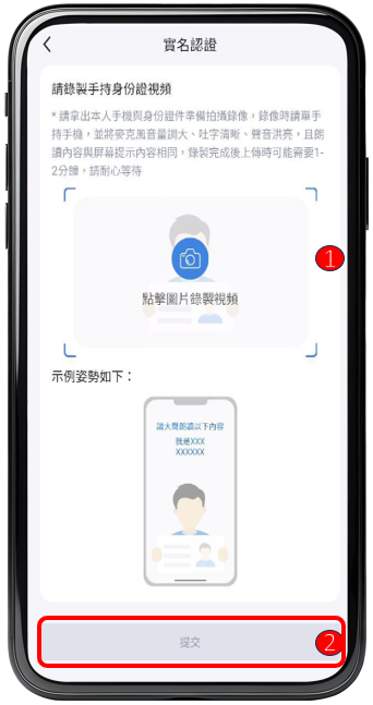① 按照指示进行操作并點擊录制视频。您需要拿着您的身份证或护照,并念出您的姓名和视频中显示的验证码 。