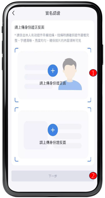 ① 根据您提交的证件类型上传【 身份证 】或【 护照 】正反面 。