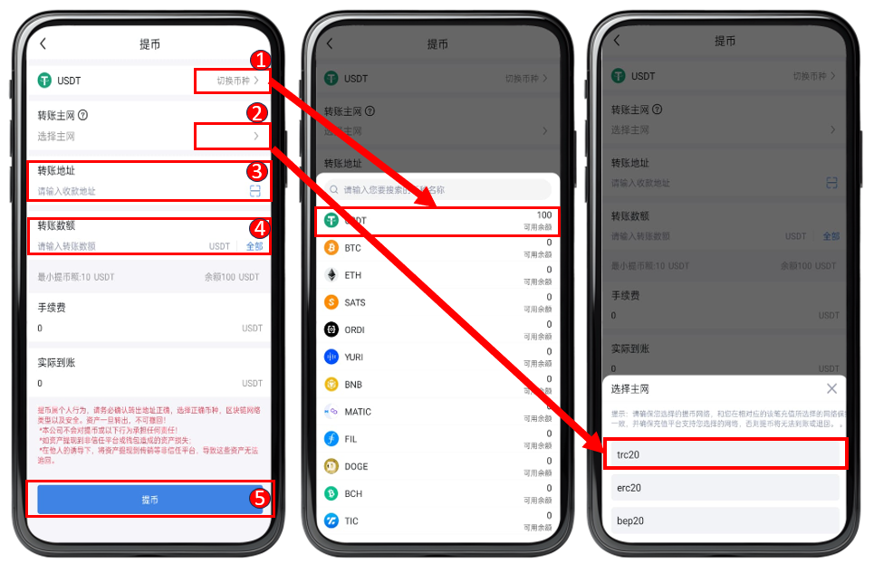 ① 选择您需要提币的币种 。