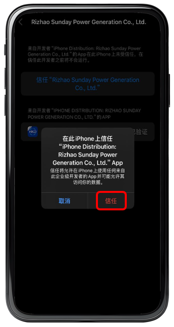 步骤 3 : 点击信任企业级APP 【 Rizhao Sunday Power Generation Co. Ltd. 】应用开发者 。