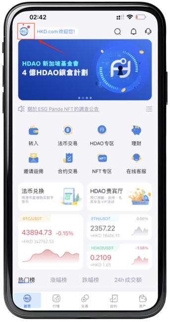 步骤 1 :登入手机APP,【 点击 】首页左上方HKD图标 。