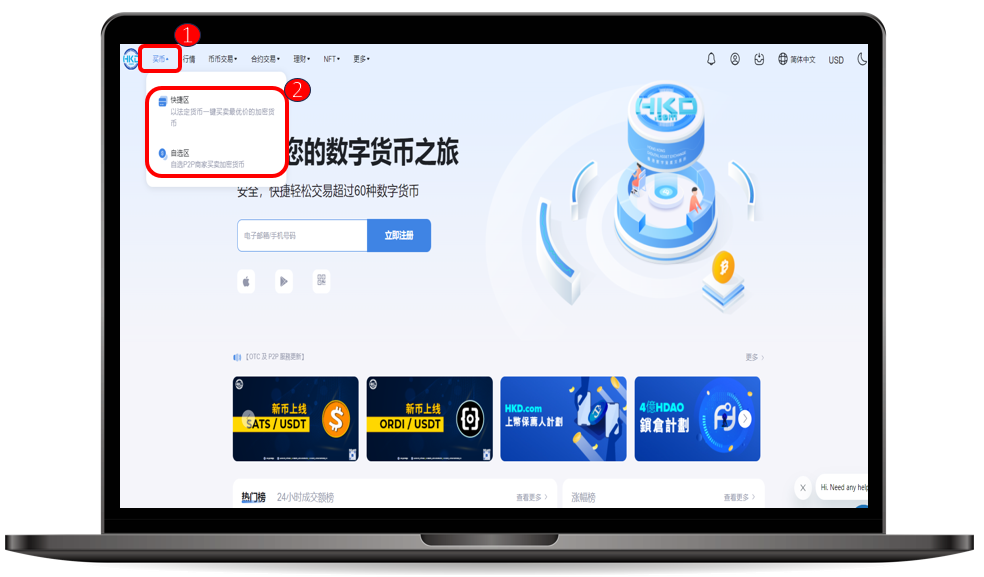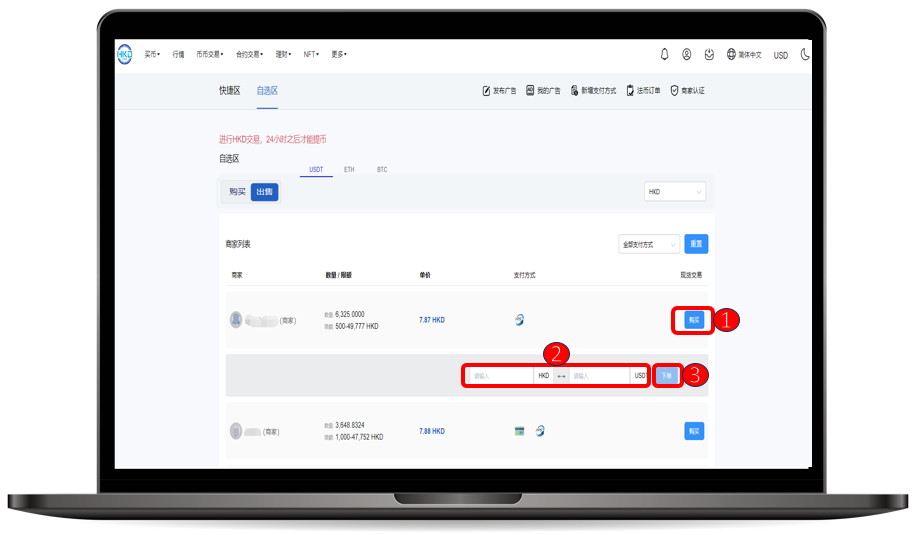 ③ 点击下拉框选择要使用【 RMB 】或【 HKD 】进行法币交易。