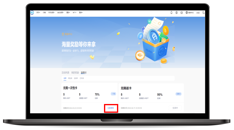 无限次返佣卡 :在期限内可以一直使用至额度用完,用户无需点击立即启用 ,获得该返佣卡时会是自动生效状态。