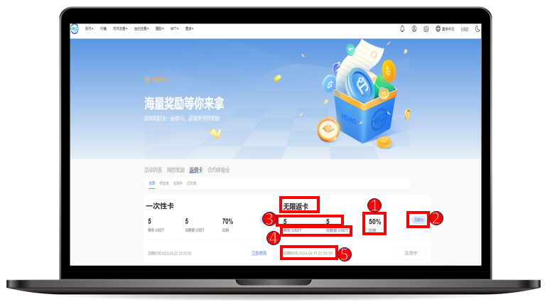 ⑤ 期限时间,无限期返佣卡必须在期限内将额度用完,否则到达期限即使还有余额都会失效。