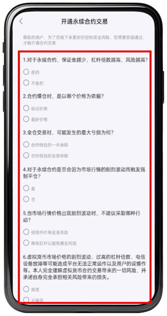 步骤 4 :进入答题页面进行答题,完成答题后即能开通永续合约合约交易。