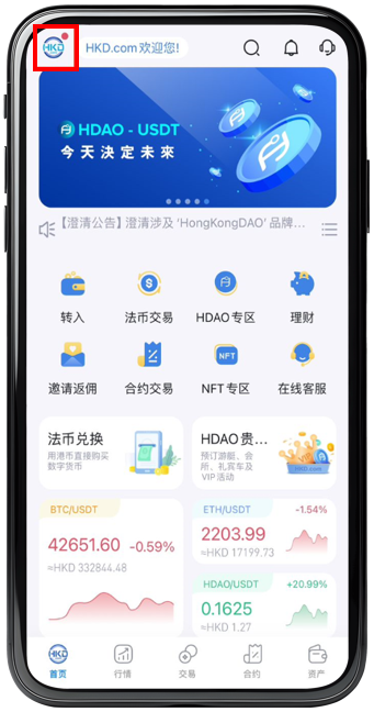 步骤 1 :登入HKD.com应用程式后点击左上方的 HKD.com 标志。