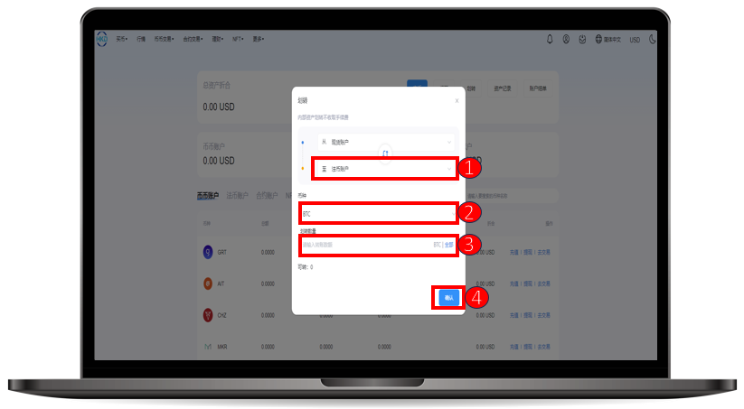 ① 从【现货账户】划转 USDT 至【逐仓合约账户】账户中,您可以选择想交易的合约币种。