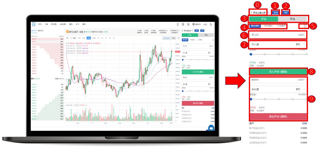 ⑦ 输入开仓数量,可选择以【 BTC 】数量,【 USDT 】或 【 张数 】进行开仓,系统会按照选择类型进行计算保证金。