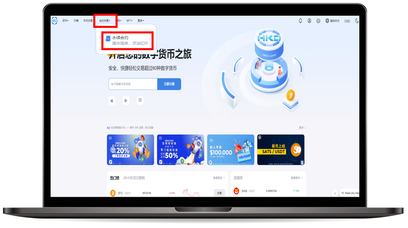 步骤 1 :登入HKD.com网页版后点击上方【 合约交易 】,选择【 永续合约 】