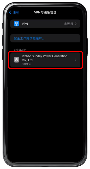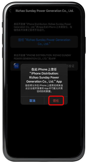 步驟 3 : 點擊信任企業級APP 【 Rizhao Sunday Power Generation Co. Ltd. 】應用程式開發者 。