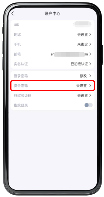 步驟 3 :點擊資金密碼右邊的【 去設定 】鍵 。