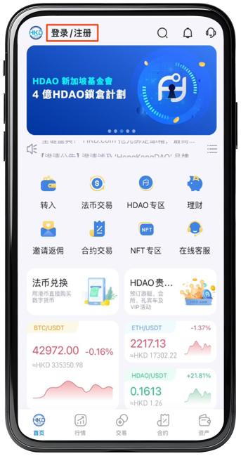步驟 1 : 登入 HKD.com應用程式後點擊左上方的【 登入/註冊 】