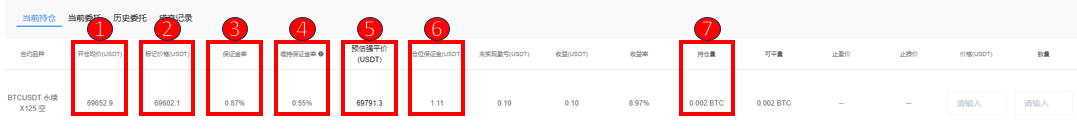 ⑤ 预估强平价格 :当标记价到达预估强平价格,您的仓位将触发强制平仓。